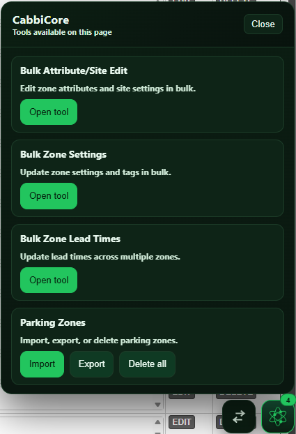 The console appears in the bottom-right corner of your iCabbi screen whenever a CabbiCore feature or setting is available for the page you are on. For example, tools such as Bulk Zone Settings now live inside the CabbiCore Console rather than inside the iCabbi navigation.